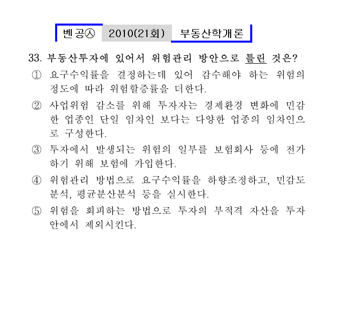 21회㉦33. 부동산투자에 있어서 위험관리 방안으로 틀린 것은?