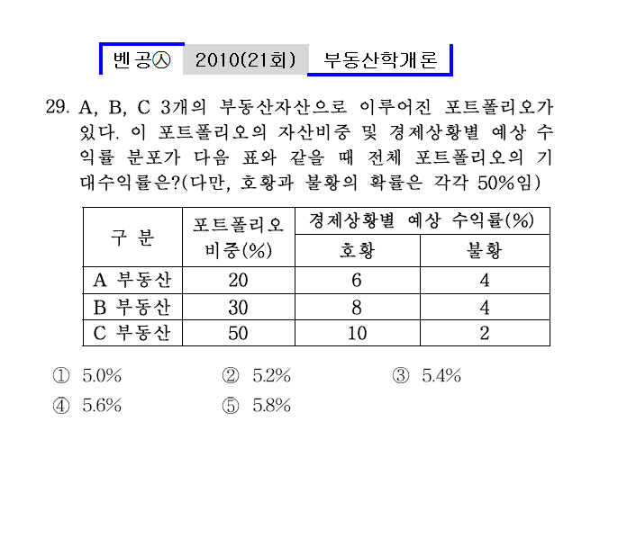 21회㉦29. A, B, C 3개의 부동산자산으로 이루어진 포트폴리오가 있다. 이 포트폴리오의 자산비중 및 경제상황별 예상 수익률 분포가 다음 표와 같을 때 전체 포트폴리오의 기대수익률은?(다만, 호황과 불황의 확률은 각각 50%임)