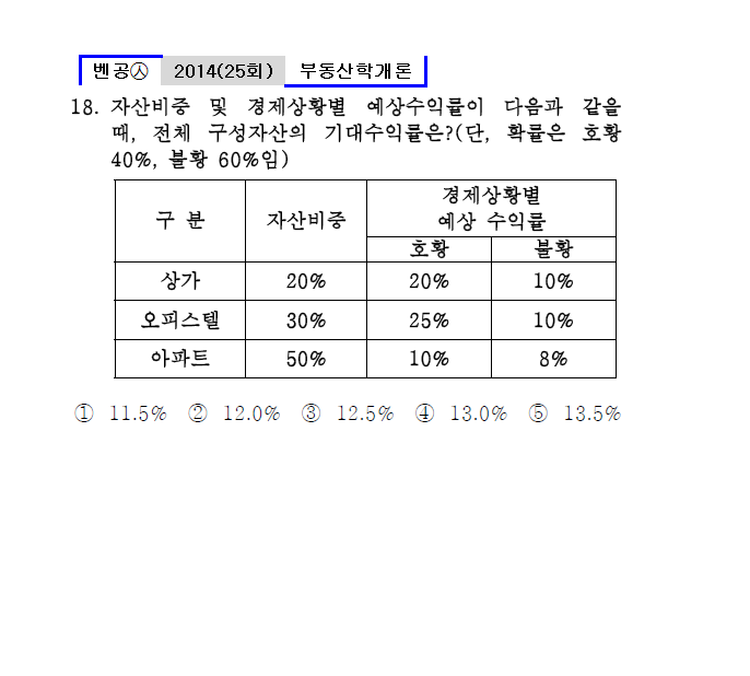 25회㉦18. 자산비중 및 경제상황별 예상수익률이 다음과 같을 때, 전체 구성자산의 기대수익률은?(단, 확률은 호황 40%, 불황 60%임)