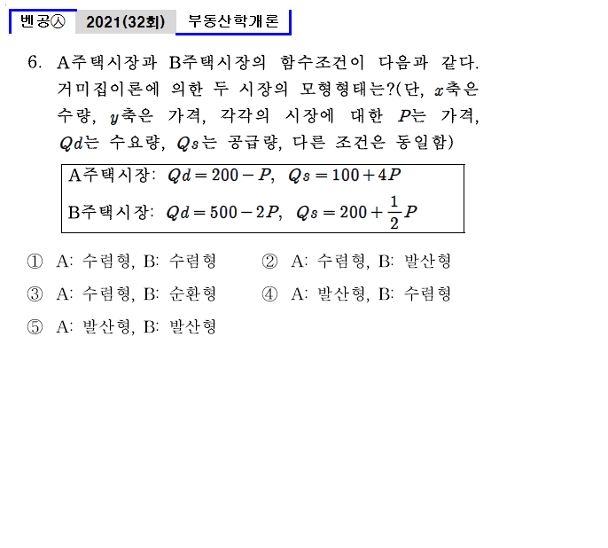| 벤공㉦32_6. A주택시장과 B주택시장의 함수조건이 다음과 같다. 거미집이론에 의한 두 시장의 모형형태는?(단, x축은 수량, y축은 가격, 각각의 시장에 대한 P는 가격, Qd는 수요량, Qs는 공급량, 다른 조건은 동일함) A주택시장: Qd = 200 - P , Qs = 100+ 4P B주택시장: Qd = 500 - 2P , Qs = 200+ 1/2P ① A: 수렴형, B: 수렴형 ② A: 수렴형, B: 발산형 ③ A: 수렴형, B: 순환형 ④ A: 발산형, B: 수렴형 ⑤ A: 발산형, B: 발산형 |