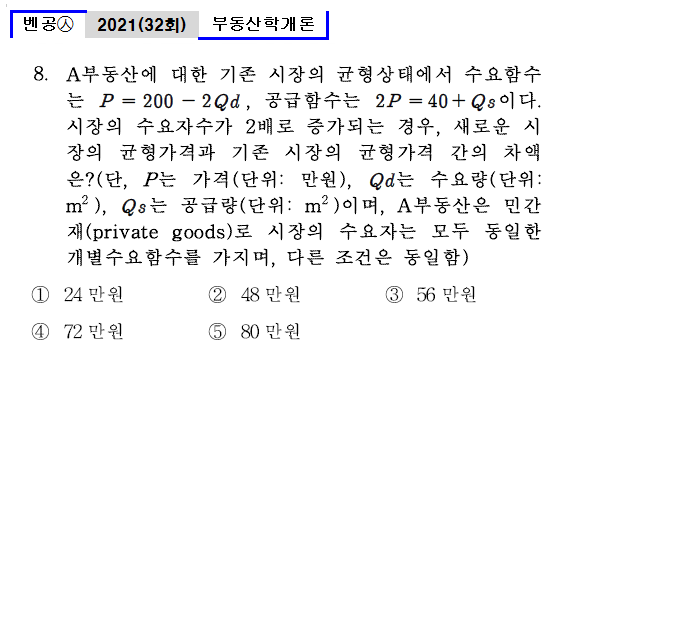 | 벤공㉦32_8. A부동산에 대한 기존 시장의 균형상태에서 수요함수는 P = 200 -2Qd , 공급함수는 2P = 40 + Qs이다. 시장의 수요자수가 2배로 증가되는 경우, 새로운 시장의 균형가격과 기존 시장의 균형가격 간의 차액 은? (단, P는 가격(단위: 만원), Qd는 수요량(단위: ㎡ ), Qs는 공급량(단위: ㎡ )이며, A부동산은 민간재(private goods)로 시장의 수요자는 모두 동일한 개별수요함수를 가지며, 다른 조건은 동일함) ① 24만원 ② 48만원 ③ 56만원 ④ 72만원 ⑤ 80만원 |