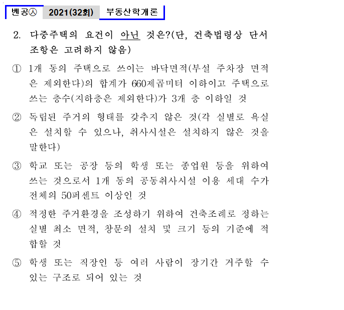 | 벤공㉦32_2. 다중주택의 요건이 아닌 것은? (단, 건축법령상 단서조항은 고려하지 않음) ① 1개 동의 주택으로 쓰이는 바닥면적(부설 주차장 면적은 제외한다)의 합계가 660제곱미터 이하이고 주택으로 쓰는 층수(지하층은 제외한다)가 3개 층 이하일 것 ② 독립된 주거의 형태를 갖추지 않은 것(각 실별로 욕실은 설치할 수 있으나, 취사시설은 설치하지 않은 것을 말한다) ③ 학교 또는 공장 등의 학생 또는 종업원 등을 위하여 쓰는 것으로서 1개 동의 공동취사시설 이용 세대 수가 전체의 50퍼센트 이상인 것 ④ 적정한 주거환경을 조성하기 위하여 건축조례로 정하는 실별 최소 면적, 창문의 설치 및 크기 등의 기준에 적합할 것 ⑤ 학생 또는 직장인 등 여러 사람이 장기간 거주할 수 있는 구조로 되어 있는 것 |
