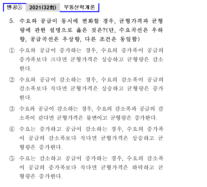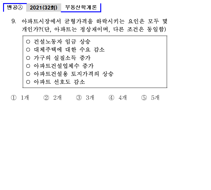 | 벤공㉦32_9. 아파트시장에서 균형가격을 하락시키는 요인은 모두 몇 개인가? (단, 아파트는 정상재이며, 다른 조건은 동일함) ○ 건설노동자 임금 상승 ○ 대체주택에 대한 수요 감소 ○ 가구의 실질소득 증가 ○ 아파트건설업체수 증가 ○ 아파트건설용 토지가격의 상승 ○ 아파트 선호도 감소 ① 1개 ② 2개 ③ 3개 ④ 4개 ⑤ 5개 |