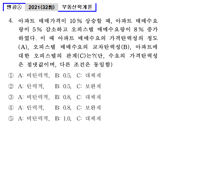 | 벤공㉦32_4. 아파트 매매가격이 10 % 상승할 때, 아파트 매매수요량이 5 % 감소하고 오피스텔 매매수요량이 8 % 증가하였다. 이 때 아파트 매매수요의 가격탄력성의 정도(A), 오피스텔 매매수요의 교차탄력성(B), 아파트에 대한 오피스텔의 관계(C)는?(단, 수요의 가격탄력성은 절댓값이며, 다른 조건은 동일함) ① A: 비탄력적, B: 0.5, C: 대체재 ② A: 탄력적, B: 0.5, C: 보완재 ③ A: 비탄력적, B: 0.8, C: 대체재 ④ A: 탄력적, B: 0.8, C: 보완재 ⑤ A: 비탄력적, B: 1.0, C: 대체재 |