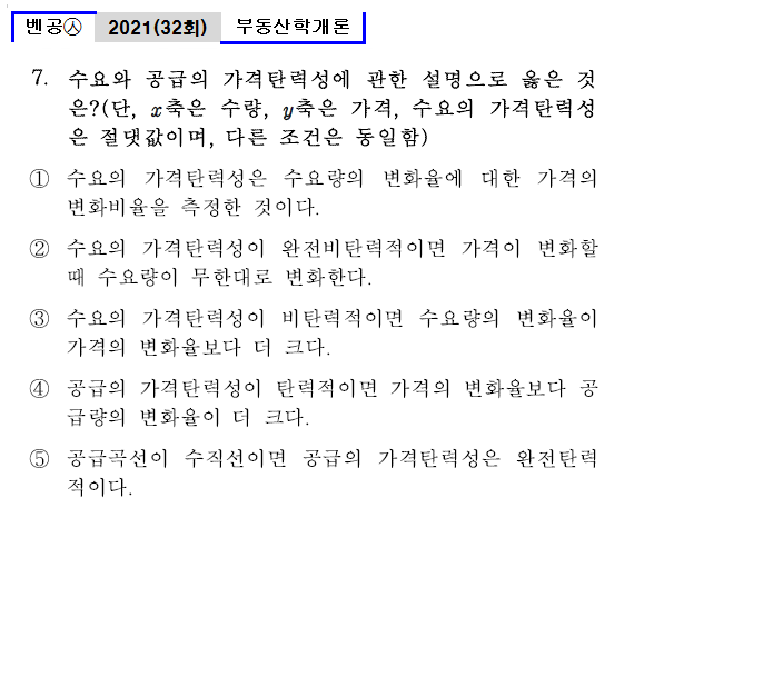 | 벤공㉦32_7. 수요와 공급의 가격탄력성에 관한 설명으로 옳은 것은? (단, x축은 수량, y축은 가격, 수요의 가격탄력성은 절댓값이며, 다른 조건은 동일함) ① 수요의 가격탄력성은 수요량의 변화율에 대한 가격의 변화비율을 측정한 것이다. ② 수요의 가격탄력성이 완전비탄력적이면 가격이 변화할 때 수요량이 무한대로 변화한다. ③ 수요의 가격탄력성이 비탄력적이면 수요량의 변화율이 가격의 변화율보다 더 크다. ④ 공급의 가격탄력성이 탄력적이면 가격의 변화율보다 공급량의 변화율이 더 크다. ⑤ 공급곡선이 수직선이면 공급의 가격탄력성은 완전탄력적이다. |