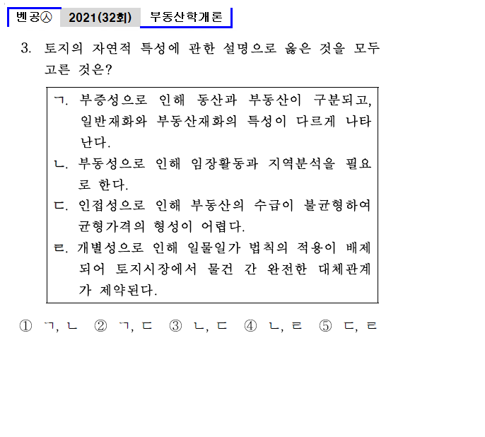 | 벤공㉦32_3. 토지의 자연적 특성에 관한 설명으로 옳은 것을 모두 고른 것은? ㄱ. 부증성으로 인해 동산과 부동산이 구분되고, 일반재화와 부동산재화의 특성이 다르게 나타난다. ㄴ. 부동성으로 인해 임장활동과 지역분석을 필요로 한다. ㄷ. 인접성으로 인해 부동산의 수급이 불균형하여 균형가격의 형성이 어렵다. ㄹ. 개별성으로 인해 일물일가 법칙의 적용이 배제되어 토지시장에서 물건 간 완전한 대체관계가 제약된다. ① ㄱ, ㄴ ② ㄱ, ㄷ ③ ㄴ, ㄷ ④ ㄴ, ㄹ ⑤ ㄷ, ㄹ |