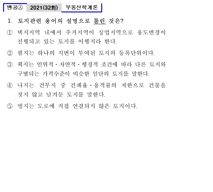 | 벤공㉦32_1. 토지관련 용어의 설명으로 틀린 것은? ① 택지지역 내에서 주거지역이 상업지역으로 용도변경이 진행되고 있는 토지를 이행지라 한다. ② 필지는 하나의 지번이 부여된 토지의 등록단위이다. ③ 획지는 인위적․자연적․행정적 조건에 따라 다른 토지와 구별되는 가격수준이 비슷한 일단의 토지를 말한다. ④ 나지는 건부지 중 건폐율․용적률의 제한으로 건물을 짓지 않고 남겨둔 토지를 말한다. ⑤ 맹지는 도로에 직접 연결되지 않은 토지이다. |