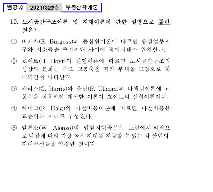 | 벤공㉦32_10. 도시공간구조이론 및 지대이론에 관한 설명으로 틀린 것은? ① 버제스(E. Burgess)의 동심원이론에 따르면 중심업무지구와 저소득층 주거지대 사이에 점이지대가 위치한다. ② 호이트(H. Hoyt)의 선형이론에 따르면 도시공간구조의 성장과 분화는 주요 교통축을 따라 부채꼴 모양으로 확대되면서 나타난다. ③ 해리스(C. Harris)와 울만(E. Ullman)의 다핵심이론에 교통축을 적용하여 개선한 이론이 호이트의 선형이론이다. ④ 헤이그(R. Haig)의 마찰비용이론에 따르면 마찰비용은 교통비와 지대로 구성된다. ⑤ 알론소(W. Alonso)의 입찰지대곡선은 도심에서외곽으로나감에따라가장높은지대를지불할수있는각산업의 지대곡선들을연결한 것이다. |