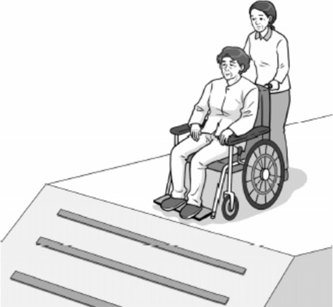 ① 휠체어를 뒤로 돌려 지그재그로 내려간다. ② 휠체어를 뒤로 돌려 앞바퀴를 들고 내려간다. ③ 휠체어를 앞으로 하여 똑바로 내려간다. ④ 휠체어를 앞으로 하여 지그재그로 내려간다. ⑤ 휠체어를 앞으로 하여 앞바퀴를 들고 내려간다. |