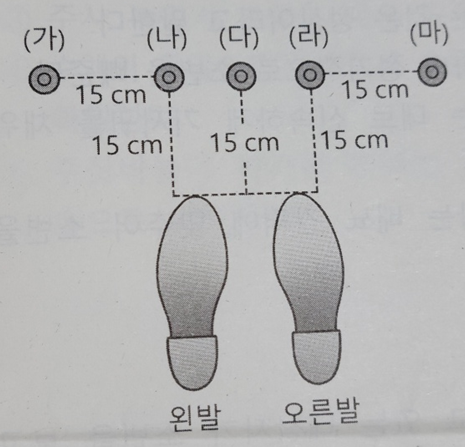 | 벤공요양㉦34회54. 다음 그림에서 오른쪽 편마비 대상자의 지팡이 보행을 도울 때 지팡이 끝(◎)을 놓는 위치로 옳은 것은? |