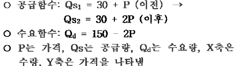 벤공㉦31회(08). A지역 아파트시장에서 수요함수는 일정한데, 공급함수는 다음 조건과 같이 변화하였다. 이 경우 균형가격(ㄱ)과 공급곡선의 기울기(ㄴ)는 어떻게 변화하였는가?(단, 가격과 수량의 단위는 무시하며, 주어진 조건에 한함) |