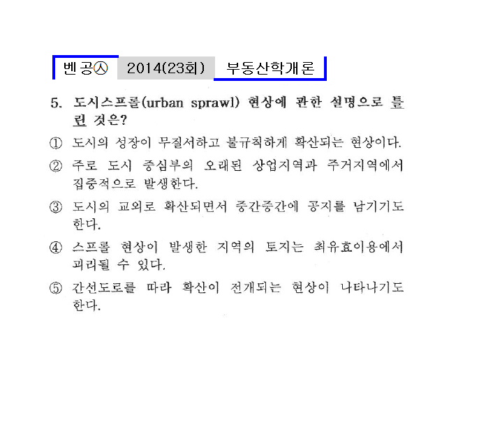 23회㉦5. 도시스프롤(urban sprawl) 현상에 관한 설명으로 틀린 것은? ① 도시의 성장이 무질서하고 불규칙하게 확산되는 현상이다. ● 주로 도시 ③ 도시의 교외로 확산되면서 중간중간에 공지를 남기기도 한다. ④ 스프롤 현상이 발생한 지역의 토지는 최유효이용에서 괴리될 수 있다. ⑤ 간선도로를 따라 확산이 전개되는 현상이 나타나기도 한다. |
