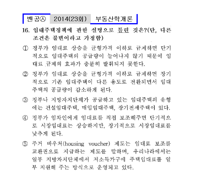 23회㉦16. 임대주택정책에 관한 설명으로 틀린 것은?(단, 다른 조건은 불변이라고 가정함) ● 정부가 임대료 상승을 균형가격 이하로 규제하면 ② 정부가 임대료 상승을 균형가격 이하로 규제하면 장기적으로 기존 임대주택이 다른 용도로 전환되면서 임대주택의 공급량이 감소하게 된다. ③ 정부나 지방자치단체가 공급하고 있는 임대주택의 유형에는 건설임대주택, 매입임대주택, 장기전세주택이 있다. ④ 정부가 임차인에게 임대료를 직접 보조해주면 단기적으로 시장임대료는 상승하지만, 장기적으로 시장임대료를 낮추게 된다. ⑤ 주거 바우처(housing voucher) 제도는 임대료 보조를 교환권으로 지급하는 제도를 말하며, 우리나라에서는 일부 지방자치단체에서 저소득가구에 주택임대료를 일부 지원해 주는 방식으로 운영되고 있다. |