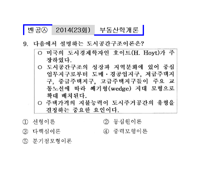 23회㉦9. 다음에서 설명하는 도시공간구조이론은? ㅇ 미국의 도시경제학자인 호이트(H. Hoyt)가 주장하였다. ㅇ 도시공간구조의 성장과 지역분화에 있어 중심업무지구로부터 도매․경공업지구, 저급주택지구, 중급주택지구, 고급주택지구들이 주요 교통노선에 따라 쐐기형(wedge) 지대 모형으로 확대 배치된다. ㅇ 주택가격의 지불능력이 도시주거공간의 유형을 결정하는 중요한 요인이다. ● 선형이론 ② 동심원이론 ③ 다핵심이론 ④ 중력모형이론 ⑤ 분기점모형이론 |