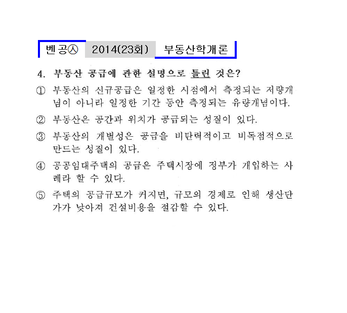 23회㉦4. 부동산 공급에 관한 설명으로 틀린 것은? ① 부동산의 신규공급은 일정한 시점에서 측정되는 저량개념이 아니라 일정한 기간 동안 측정되는 유량개념이다. ② 부동산은 공간과 위치가 공급되는 성질이 있다. ● 부동산의 개별성은 공급을 비탄력적이고 ④ 공공임대주택의 공급은 주택시장에 정부가 개입하는 사례라 할 수 있다. ⑤ 주택의 공급규모가 커지면, 규모의 경제로 인해 생산단가가 낮아져 건설비용을 절감할 수 있다. |
