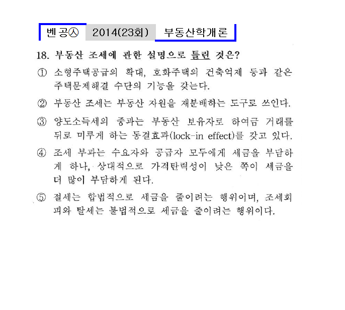 23회㉦18. 부동산 조세에 관한 설명으로 틀린 것은? ① 소형주택공급의 확대, 호화주택의 건축억제 등과 같은 주택문제해결 수단의 기능을 갖는다. ② 부동산 조세는 부동산 자원을 재분배하는 도구로 쓰인다. ③ 양도소득세의 중과는 부동산 보유자로 하여금 거래를 뒤로 미루게 하는 동결효과(lock-in effect)를 갖고 있다. ④ 조세 부과는 수요자와 공급자 모두에게 세금을 부담하게 하나, 상대적으로 가격탄력성이 낮은 쪽이 세금을 더 많이 부담하게 된다. ● 절세는 합법적으로 세금을 줄이려는 행위이며, |