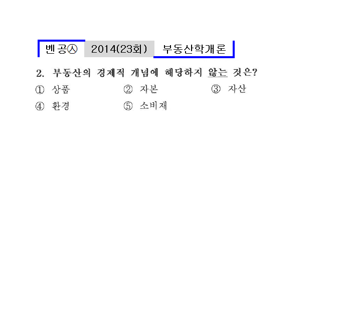 23회㉦2. 부동산의 경제적 개념에 해당하지 않는 것은? ① 상품 ② 자본 ③ 자산 ● 환경㉦기술적 개념 ⑤ 소비재 |