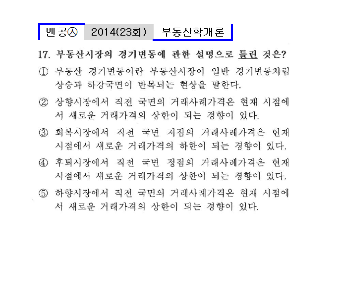 23회㉦17. 부동산시장의 경기변동에 관한 설명으로 틀린 것은? ① 부동산 경기변동이란 부동산시장이 일반 경기변동처럼 상승과 하강국면이 반복되는 현상을 말한다. ● 상향시장에서 직전 국면의 거래사례가격은 현재 시점에서 새로운 거래가격의 ③ 회복시장에서 직전 국면 저점의 거래사례가격은 현재 시점에서 새로운 거래가격의 하한이 되는 경향이 있다. ④ 후퇴시장에서 직전 국면 정점의 거래사례가격은 현재 시점에서 새로운 거래가격의 상한이 되는 경향이 있다. ⑤ 하향시장에서 직전 국면의 거래사례가격은 현재 시점에서 새로운 거래가격의 상한이 되는 경향이 있다. |