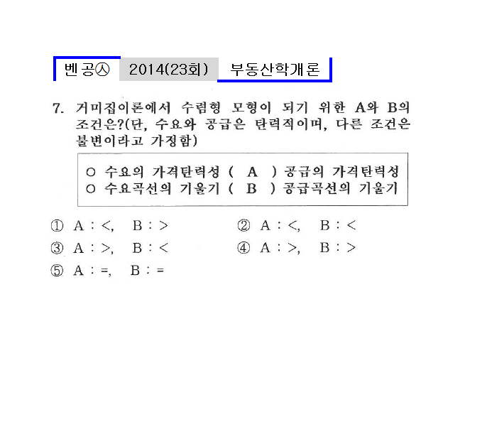 23회㉦7. 거미집이론에서 수렴형 모형이 되기 위한 A와 B의 조건은?(단, 수요와 공급은 탄력적이며, 다른 조건은 불변이라고 가정함) ㅇ 수요의 가격탄력성 ( A ) 공급의 가격탄력성 ㅇ 수요곡선의 기울기 ( B ) 공급곡선의 기울기 ① A : <, B : > ② A : <, B : < ● A : >, B : < ④ A : >, B : > ⑤ A : =, B : = |