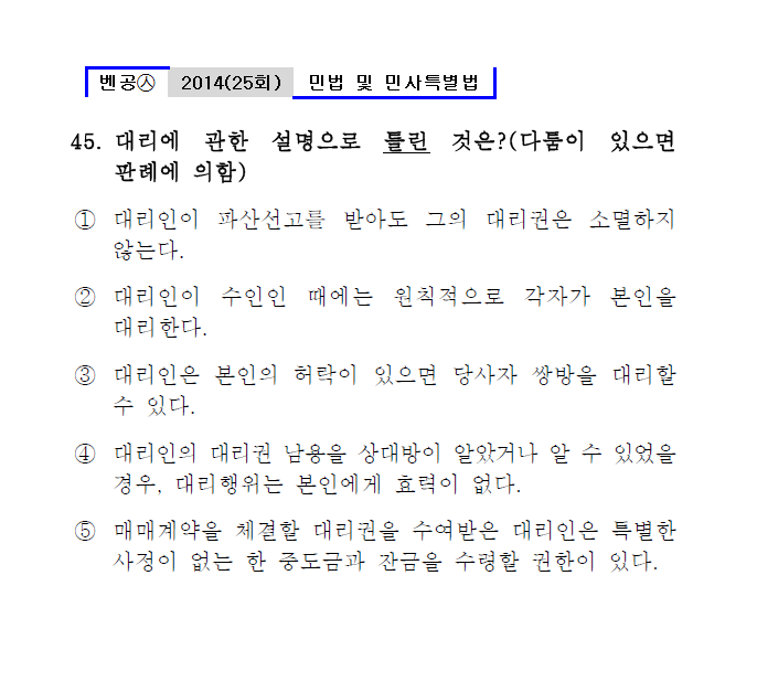 25회㉦45. 대리에 관한 설명으로 틀린 것은?(다툼이 있으면 판례에 의함) ● 대리인이 파산선고를 받아도 그의 대리권은 소멸하 ② 대리인이 수인인 때에는 원칙적으로 각자가 본인을 대리한다.㉦민법119조(각자대리) ③ 대리인은 본인의 허락이 있으면 당사자 쌍방을 대리할 수 있다.㉦민법124조(자기계약, 쌍방대리) ④ 대리인의 대리권 남용을 상대방이 알았거나 알 수 있었을 경우, 대리행위는 본인에게 효력이 없다.㉦판례2000다20694 ⑤ 매매계약을 체결할 대리권을 수여받은 대리인은 특별한 사정이 없는 한 중도금과 잔금을 수령할 권한이 있다.㉦판례91다43107 |