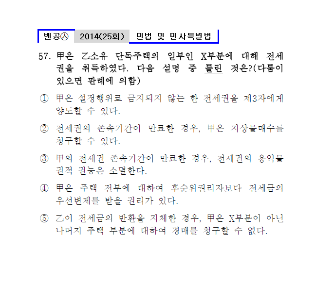 25회㉦57. 甲은 乙소유 단독주택의 일부인 X부분에 대해 전세권을 취득하였다. 다음 설명 중 틀린 것은?(다툼이 있으면 판례에 의함) ① 甲은 설정행위로 금지되지 않는 한 전세권을 제3자에게 양도할 수 있다.㉦민법제306조 ● 전세권의 존속기간이 만료한 경우, 甲은 지상물매수를 청구할 수 있다.㉦전세권설정자의 동의를 얻어 부속시킨 것인 때에는 지상물매수를 청구할 수 있다 ㉦민법제316조2항 ③ 甲의 전세권 존속기간이 만료한 경우, 전세권의 용익물 권적 권능은 소멸한다.㉦판례203다35659 ④ 甲은 주택 전부에 대하여 후순위권리자보다 전세금의 우선변제를 받을 권리가 있다.㉦판례91마256 ⑤ 乙이 전세금의 반환을 지체한 경우, 甲은 X부분이 아닌 나머지 주택 부분에 대하여 경매를 청구할 수 없다.㉦판례91마256 |