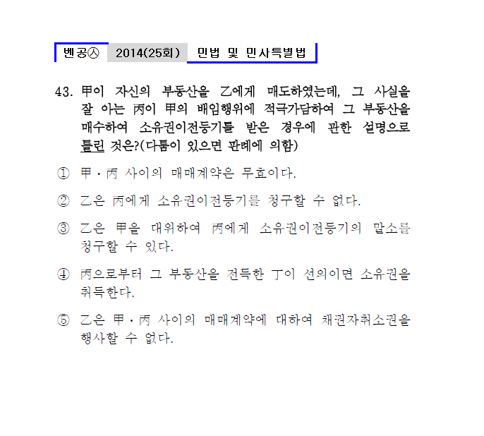 25회㉦43. 甲이 자신의 부동산을 乙에게 매도하였는데, 그 사실을 잘 아는 丙이 甲의 배임행위에 적극가담하여 그 부동산을 매수하여 소유권이전등기를 받은 경우에 관한 설명으로 틀린 것은?(다툼이 있으면 판례에 의함) ① 甲ㆍ丙 사이의 매매계약은 무효이다.㉦민법제103조(반사회질서의 법률행위) ② 乙은 丙에게 소유권이전등기를 청구할 수 없다. ③ 乙은 甲을 대위하여 丙에게 소유권이전등기의 말소를 청구할 수 있다.㉦판례83다카57-1 ● 丙으로부터 그 부동산을 전득한 丁이 선의이면 소유권을 취득 ⑤ 乙은 甲ㆍ丙 사이의 매매계약에 대하여 채권자취소권을 행사할 수 없다.㉦판례95다1965 |