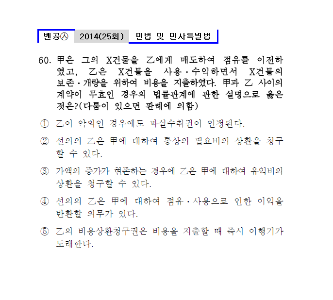 25회㉦60. 甲은 그의 X건물을 乙에게 매도하여 점유를 이전하였고, 乙은 X건물을 사용ㆍ수익하면서 X건물의 보존ㆍ개량을 위하여 비용을 지출하였다. 甲과 乙 사이의 계약이 무효인 경우의 법률관계에 관한 설명으로 옳은 것은?(다툼이 있으면 판례에 의함) ① 乙이 ② 선의의 乙은 甲에 대하여 통상의 필요비의 상환을 청구 할 수 ● 가액의 증가가 현존하는 경우에 乙은 甲에 대하여 유익비의 상환을 청구할 수 있다.㉦㉦민법제203조2 ④ 선의의 乙은 甲에 대하여 점유ㆍ사용으로 인한 이익을 반환할 의무가 ⑤ 乙의 비용상환청구권은 비용을 |
