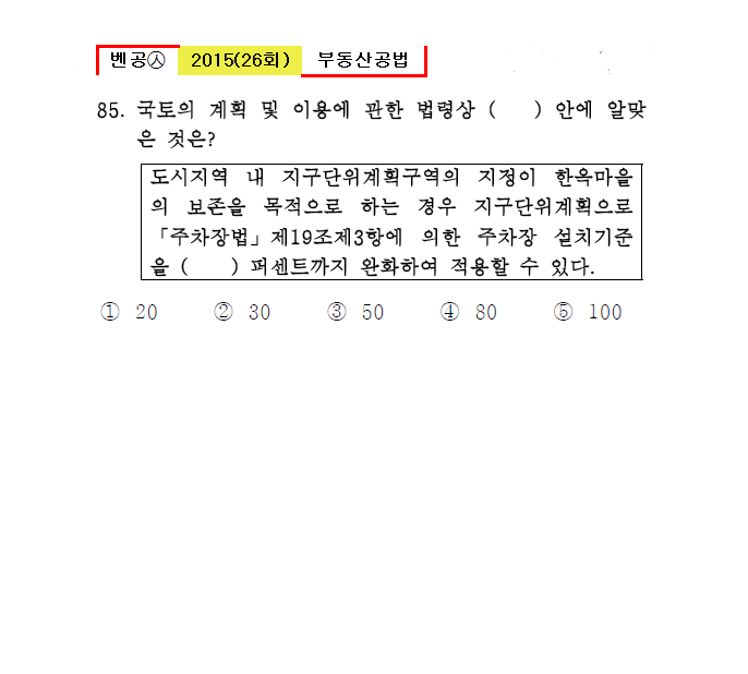 도시지역 내 지구단위계획구역의 지정이 한옥마을의 보존을 목적으로 하는 경우 지구단위계획으로 「주차장법」 제19조제3항에 의한 주차장 설치기준을 ( ) 퍼센트까지 완화하여 적용할 수 있다. |