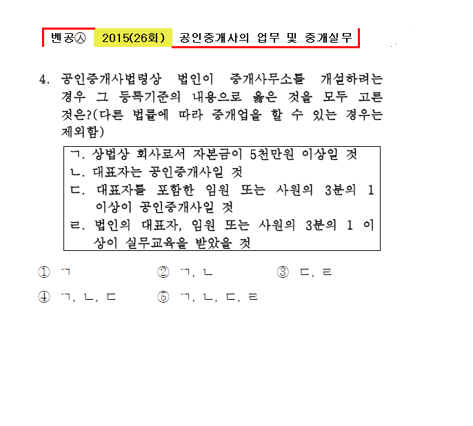 ㄱ. 상법상 회사로서 자본금이 5천만원 이상일 것 ㄴ. 대표자는 공인중개사일 것 ㄷ. 대표자를 포함한 임원 또는 사원의 3분의 1 이상이 공인중개사일 것 ㄹ. 법인의 대표자, 임원 또는 사원의 3분의 1 이상이 실무교육을 받았을 것 |