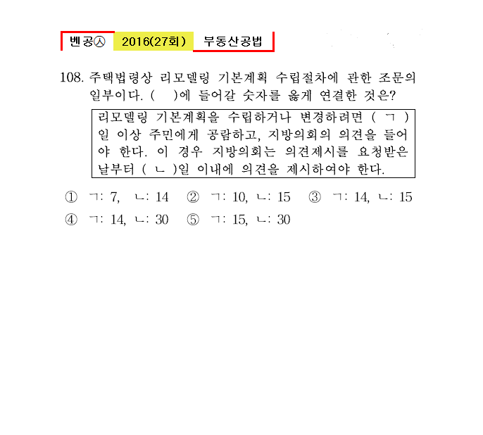 27회㉦108. 주택법령상 리모델링 기본계획 수립절차에 관한 조문의 일부이다. ( )에 들어갈 숫자를 옳게 연결한 것은?