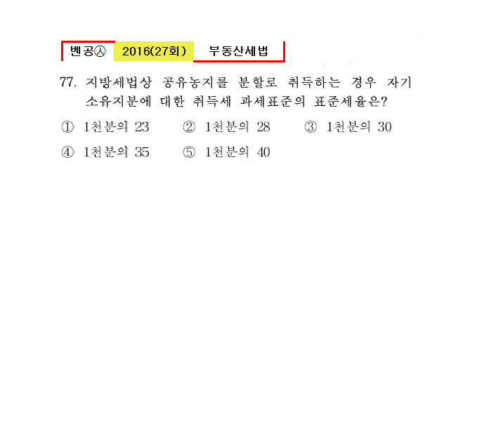 27회㉦77. 지방세법상 공유농지를 분할로 취득하는 경우 자기 소유지분에 대한 취득세 과세표준의 표준세율은?