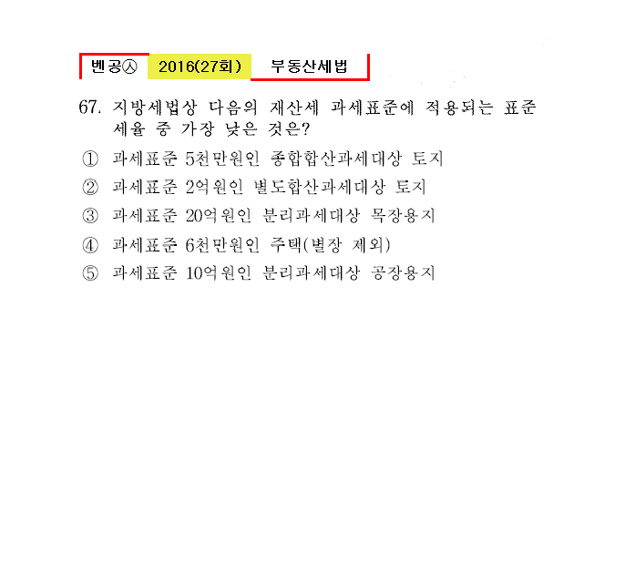 27회㉦67. 지방세법상 다음의 재산세 과세표준에 적용되는 표준세율중 가장 낮은 것은?