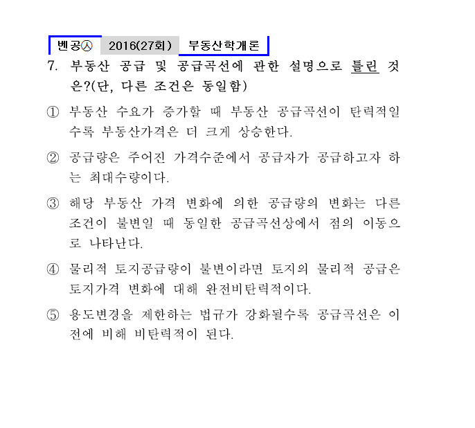 27회㉦7. 부동산 공급 및 공급곡선에 관한 설명으로 틀린 것은?(단, 다른 조건은 동일함)