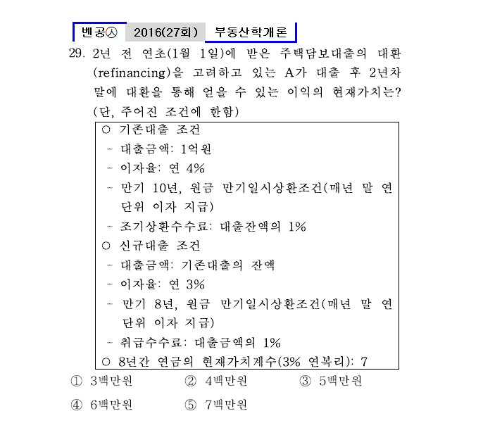 27회㉦29. 2년 전 연초(1월 1일)에 받은 주택담보대출의 대환(refinancing)을 고려하고 있는 A가 대출 후 2년차 말에 대환을 통해 얻을 수 있는 이익의 현재가치는?(단, 주어진 조건에 한함)