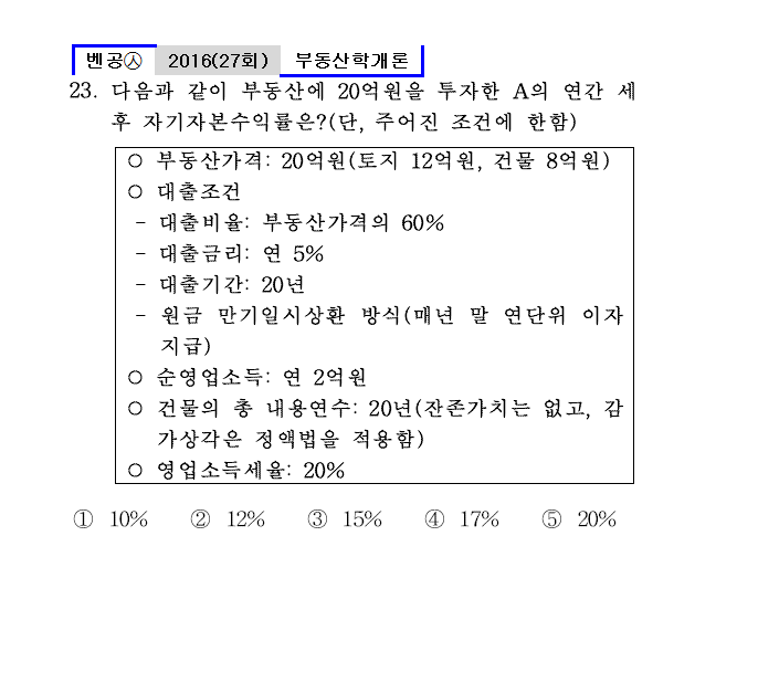 27회㉦23. 다음과 같이 부동산에 20억원을 투자한 A의 연간 세후 자기자본수익률은?(단, 주어진 조건에 한함)