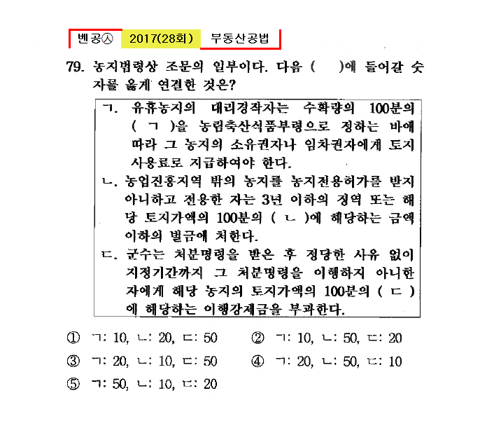 ㄱ. 유휴농지의 대리경작자는 수확량의 100분의 ( ㄱ )을 농림축산식품부령으로 정하는 바에 따라 그 농지의 소유권자나 임차권자에게 토지사용료로 지급하여야 한다. ㄴ. 농업진흥지역 밖의 농지를 농지전용허가를 받지 아니하고 전용한 자는 3년 이하의 징역 또는 해당 토지가액의 100분의 ( ㄴ )에 해당하는 금액 이하의 벌금에 처한다. ㄷ. 군수는 처분명령을 받은 후 정당한 사유 없이 지정기간까지 그 처분명령을 이행하지 아니한 자에게 해당 농지의 토지가액의 100분의 ( ㄷ )에 해당하는 이행강제금을 부과한다. |