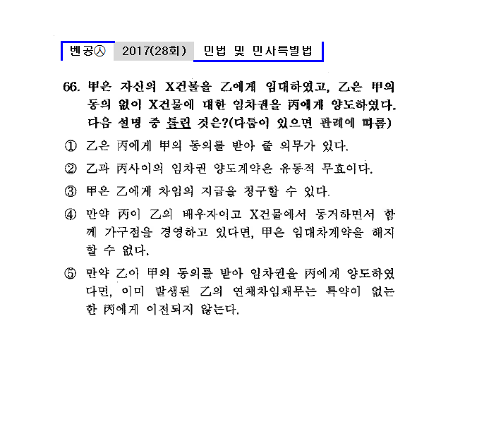 28회㉦66. 甲은 자신의 X건물을 乙에게 임대하였고, 乙은 甲의 동의 없이 X건물에 대한 임차권을 丙에게 양도하였다. 다음 설명 중 틀린 것은?(다툼이 있으면 판례에 따름)