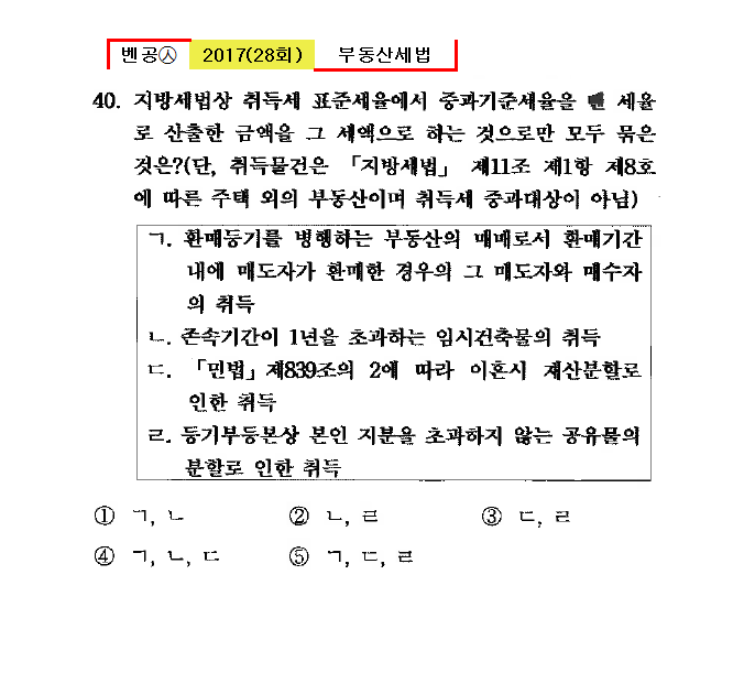 28회㉦40. 지방세법상 취득세 표준세율에서 증과기준세율을 뺀 세율로 산출한 금액을 그 세액으로 하는 것으로만 모두 묶은 것은?(단, 취득물건은 「지방세법」 제11조 제1항 제8호에 따른 주택 외의 부동산이며 취득세 증과대상이 아님)
