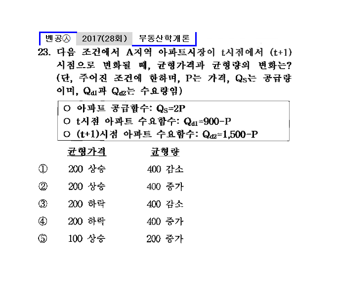 28회㉦23. 다음 조건에서 A지역 아파트시장이 t시점에서 (t + 1)시점으로 변화될 때, 균형가격과 균형량의 변화는?
