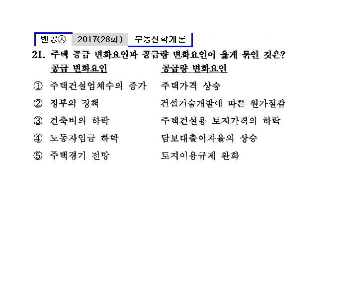 28회㉦21. 주택 공급 변화요인과 공급량 변화요인이 옳게 묶인 것은?