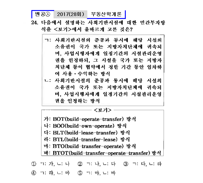 <보기> 가: BOT(build-operate-transfer) 방식 나: BOO(build-own-operate) 방식 다: BLT(build-lease-transfer) 방식 라: BTL(build-transfer-lease) 방식 마: BTO(build-transfer-operate) 방식 바: BTOT(build-transfer-operate-transfer) 방식 |