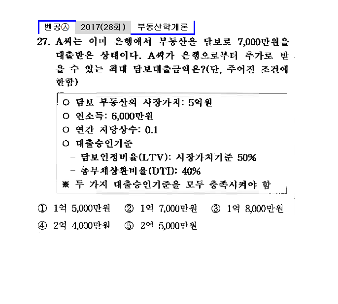 28회㉦27. A씨는 이미 은행에서 부동산을 담보로 7,000만원을 대출받은 상태이다. A씨가 은행으로부터 추가로 받을 수 있는 최대 담보대출금액은?(단, 주어진 조건에 한함)