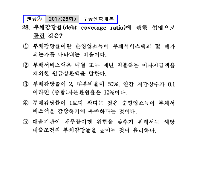 28회㉦28. 부채감당률(dedt coverage ratio)에 관한 설명으로 틀린 것은?