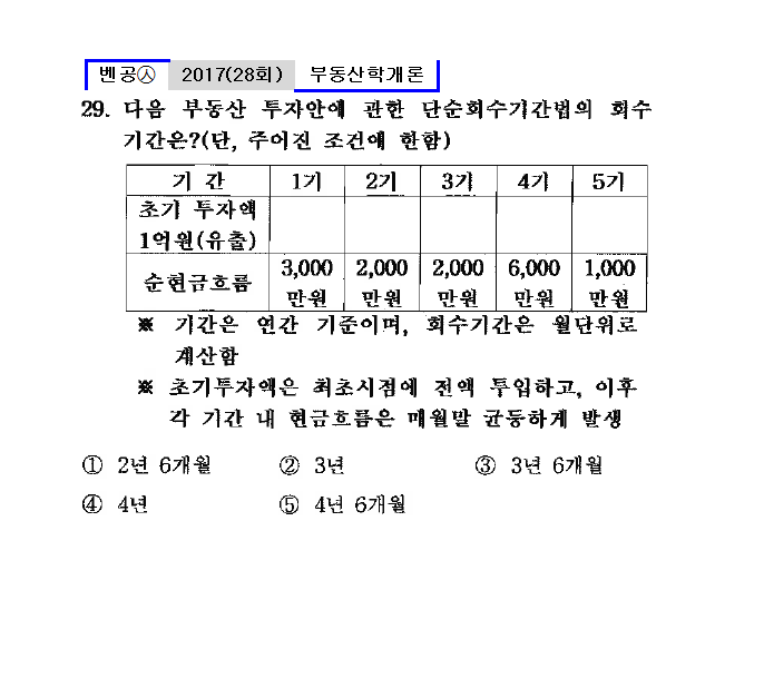 28회㉦29. 다음 부동산 투자안에 관한 단순회수기간법의 회수 기간은?(단, 주어진 조건에 한함)