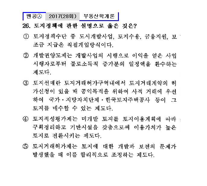 ⑤ 토지거래허가제는 토지에 대한 개발과 보전의 문제가 발생했을 때 이를 합리적으로 조정하는 제도다.㉦토지적성평가제