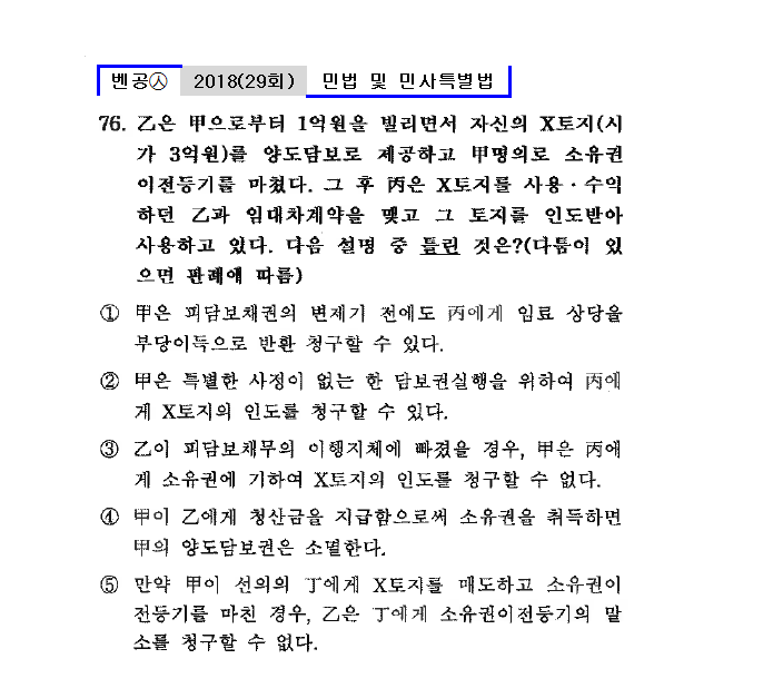 29회㉦76. 乙은 甲으로부터 1억원을 빌리면서 자신의 X토지(시가 3억원)를 양도담보로 제공하고 甲명의로 소유권이전등기를 마쳤다. 그 후 丙은 X토지를 사용ㆍ수익하던 乙과 임대차계약을 맺고 그 토지를 인도받아 사용하고 있다. 다음 설명 중 틀린 것은?(다툼이 있으면 판례에 따름)