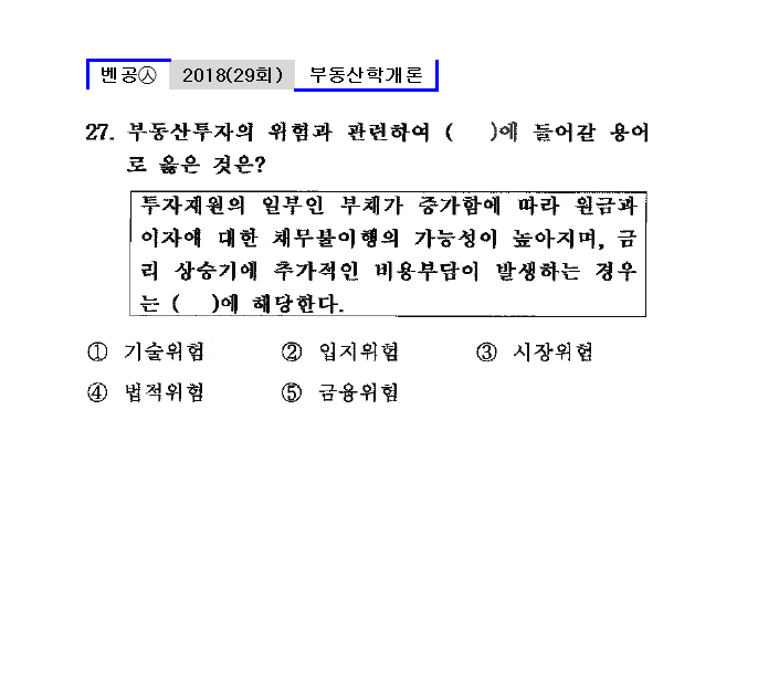 29회㉦27. 부동산투자의 위험과 관련하여 ( )에 들어간 용어로 옳은 것은?