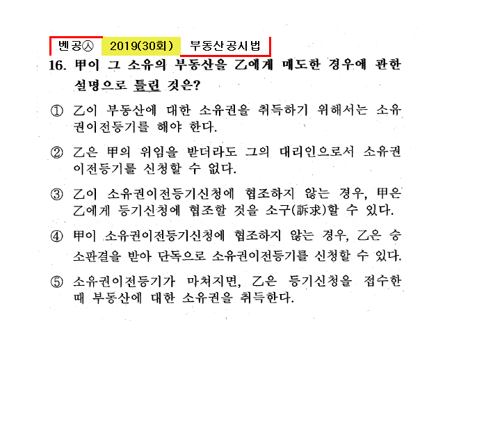 30회㉦16. 甲이 그 소유의 부동산을 乙에게 매도한 경우에 관한 설명으로 틀린 것은? ① 乙이 부동산에 대한 소유권을 취득하기 우해서는 소유권이전등기를 해야 한다. ● 乙은 甲의 위임을 받더라도 그의 대리인으로서 소유권이전등기를 신청할 수 ③ 乙이 소유권이전등기신청에 협조하지 않는 경우, 甲은 乙에게 등기신청에 협조할 것을 소구(訴求)할 수 있다. ④ 甲이 소유권이전등기신청에 협조하지 않는 경우, 乙은 승소판결을 받아 단독으로 소유권이전등기를 신청할 수 있다. ⑤ 소유권이전등기가 마쳐지면, 乙은 등기신청을 접수한 때 부동산에 대한 소유권을 취득한다. |