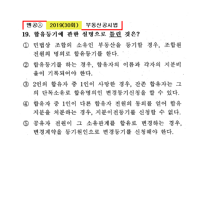 30회㉦19. 합유등기에 관한 설명으로 틀린 것은? ① 민법상 조합의 소유인 부동산을 등기할 경우, 조합원 전원의 명의로 합유등기를 한다. ● 합유등기를 하는 경우, 합유자의 이름과 ③ 2인의 합유자 중 1인이 사망한 경우, 잔존 합유자는 그의 단독소유로 합유명의인 변경등기신청을 할 수 있다. ④ 합유자 중 1인이 다른 합유자 전원의 동의를 얻어 합유지분을 처분하는 경우, 지분이전등기를 신청할 수 없다. ⑤ 공유자 전원이 그 소유관계를 합유로 변경하는 경우, 변경계약을 등기원인으로 변경등기를 신청해야 한다. |