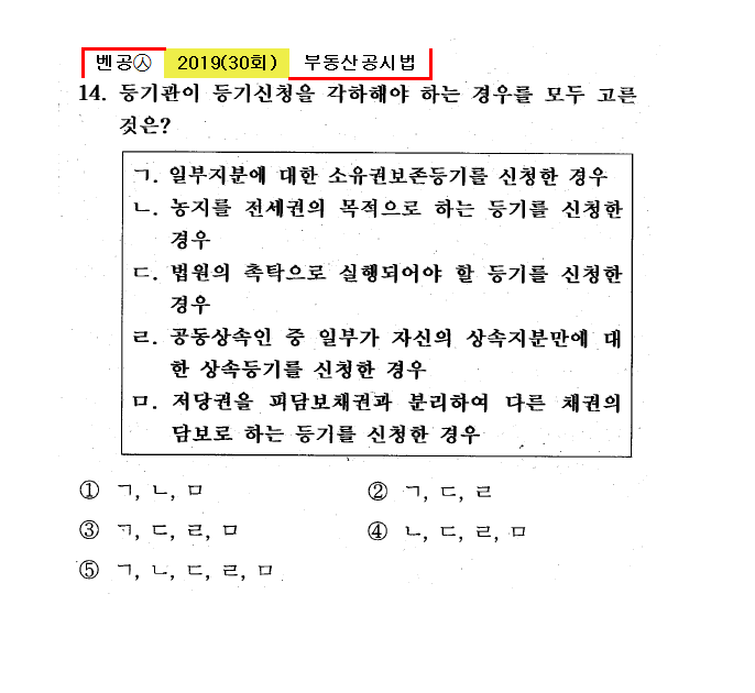 30회㉦14. 등기관이 등기신청을 각하해야 하는 경우를 모두 고른 것은? ㄱ. 일부지분에 대한 소유권보존등기를 신청한 경우 ㄴ. 농지를 전세권의 목적으로 하는 등기를 신청한 경우 ㄷ. 법원의 촉탁으로 실행되어야 할 등기를 신청한 경우 ㄹ. 공동상속인 중 일부가 자신의 상속지분만에 대한 상속등기를 신청한 경우 ㅁ. 저당권을 피담보채권과 분리하여 다른 채권의 담보로 하는 등기를 신청한 경우 ① ㄱ, ㄴ, ㅁ ② ㄱ, ㄷ, ㄹ ③ ㄱ, ㄷ, ㄹ, ㅁ ④ ㄴ, ㄷ, ㄹ, ㅁ ● ㄱ, ㄴ, ㄷ, ㄹ, ㅁ |